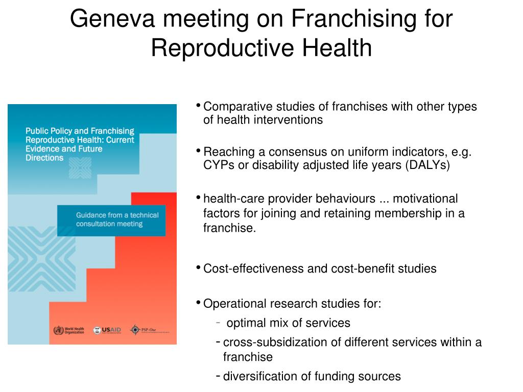Geneva meeting on Franchising for Reproductive Health • Comparative studies of franchises with other types of health interventions • Reaching a consensus on uniform indicators, e.g. CYPs or disability adjusted life years (DALYs) • health-care provider behaviours ... motivational factors for joining and retaining membership in a franchise. • Cost-effectiveness and cost-benefit studies • Operational research studies for: • optimal mix of services • cross-subsidization of different services within a franchise • diversification of funding sources