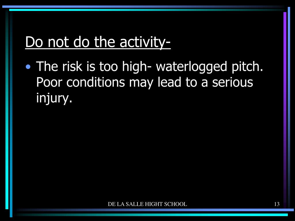 Do not do the activity- • The risk is too high- waterlogged pitch. Poor conditions may lead to a serious injury. DE LA SALLE HIGHT SCHOOL