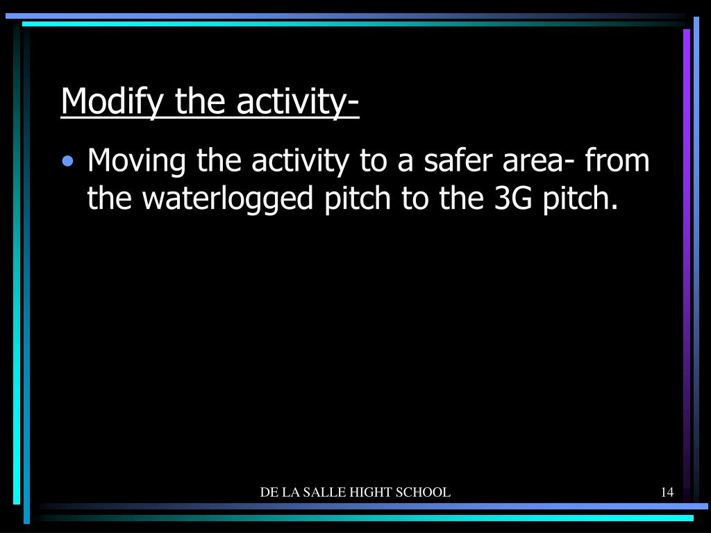 Modify the activity- • Moving the activity to a safer area- from the waterlogged pitch to the 3G pitch. DE LA SALLE HIGHT SCHOOL