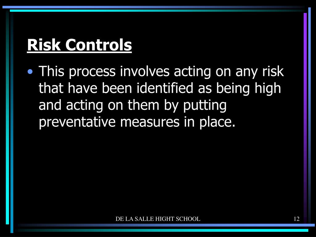 Risk Controls • This process involves acting on any risk that have been identified as being high and acting on them by putting preventative measures in place. DE LA SALLE HIGHT SCHOOL