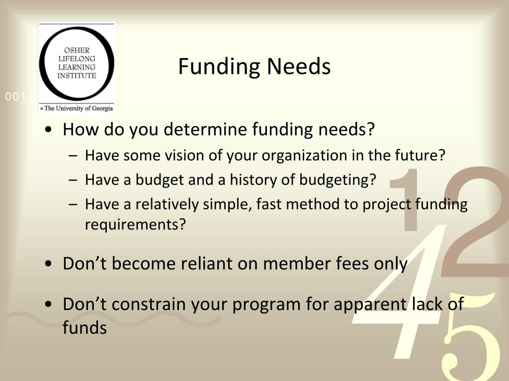 Funding Needs • How do you determine funding needs? • Have some vision of your organization in the future? • Have a budget and a history of budgeting? • Have a relatively simple, fast method to project funding requirements? • Don’t become reliant on member fees only • Don’t constrain your program for apparent lack of funds