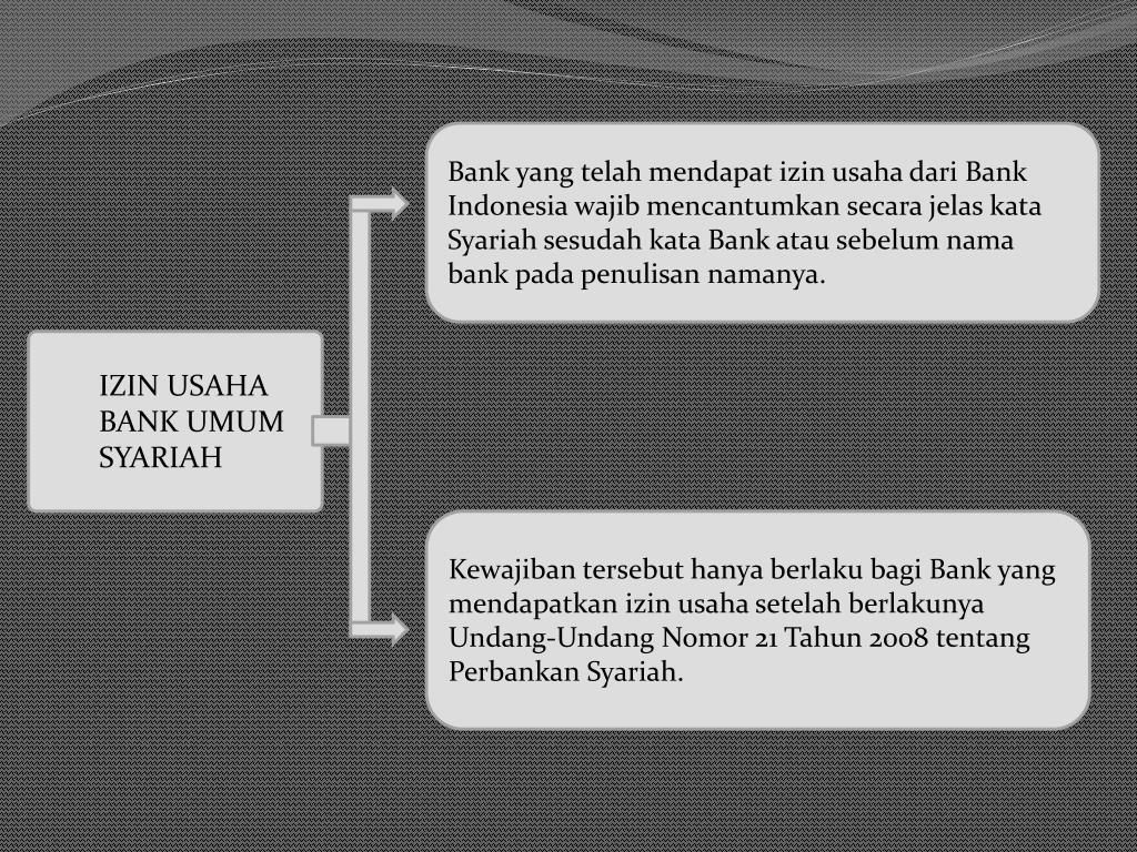 Bank yang telahmendapatizinusahadari Bank Indonesia wajibmencantumkansecarajelaskata Syariahsesudahkata Bank atausebelumnama bank padapenulisannamanya. IZIN USAHA BANK UMUM SYARIAH Kewajiban tersebut hanya berlaku bagi Bank yang mendapatkan izin usaha setelah berlakunya Undang-Undang Nomor 21 Tahun 2008 tentang Perbankan Syariah.