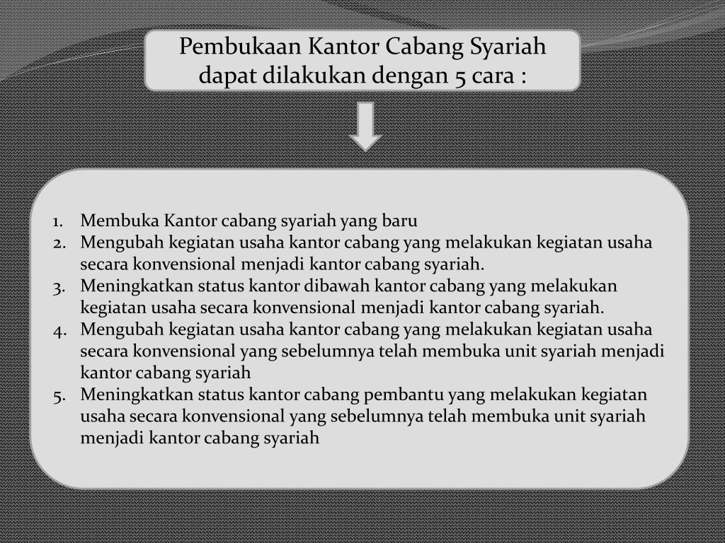 Pembukaan Kantor CabangSyariahdapatdilakukandengan 5 cara : Membuka Kantor cabangsyariah yang baru Mengubahkegiatanusahakantorcabang yang melakukankegiatanusahasecarakonvensionalmenjadikantorcabangsyariah. Meningkatkan status kantordibawahkantorcabang yang melakukankegiatanusahasecarakonvensionalmenjadikantorcabangsyariah. Mengubahkegiatanusahakantorcabang yang melakukankegiatanusahasecarakonvensional yang sebelumnyatelahmembuka unit syariahmenjadikantorcabangsyariah Meningkatkan status kantorcabangpembantu yang melakukankegiatanusahasecarakonvensional yang sebelumnyatelahmembuka unit syariahmenjadikantorcabangsyariah