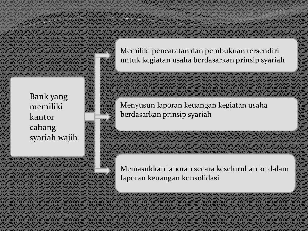 Memilikipencatatandanpembukuantersendiri untukkegiatanusahaberdasarkanprinsipsyariah Bank yang memilikikantorcabangsyariahwajib: Menyusunlaporankeuangankegiatanusaha berdasarkanprinsipsyariah Memasukkanlaporansecarakeseluruhankedalam laporankeuangankonsolidasi