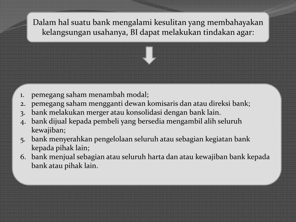Dalamhalsuatu bank mengalamikesulitan yang membahayakankelangsunganusahanya, BI dapatmelakukantindakan agar: 1. pemegangsahammenambah modal; pemegangsahammenggantidewankomisarisdanataudireksi bank; bank melakukan merger ataukonsolidasidengan bank lain. 4. bank dijualkepadapembeli yang bersediamengambilalihseluruhkewajiban; 5. bank menyerahkanpengelolaanseluruhatausebagiankegiatan bank kepadapihak lain; 6. bank menjualsebagianatauseluruhhartadanataukewajiban bank kepada bank ataupihak lain.