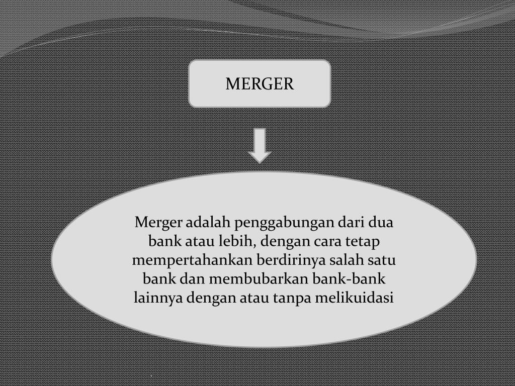 MERGER Merger adalahpenggabungandaridua bank ataulebih, dengancaratetapmempertahankanberdirinyasalahsatu bank danmembubarkan bank-bank lainnyadenganatautanpamelikuidasi .