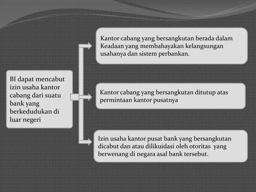 Kantor cabang yang bersangkutanberadadalam Keadaan yang membahayakankelangsungan usahanyadansistemperbankan. BI dapatmencabut izinusahakantor cabangdarisuatu bank yang berkedudukandi luarnegeri Kantor cabang yang bersangkutan ditutup atas permintaan kantor pusatnya Izin usaha kantor pusat bank yang bersangkutan dicabut dan atau dilikuidasi oleh otoritas yang berwenang di negara asal bank tersebut.
