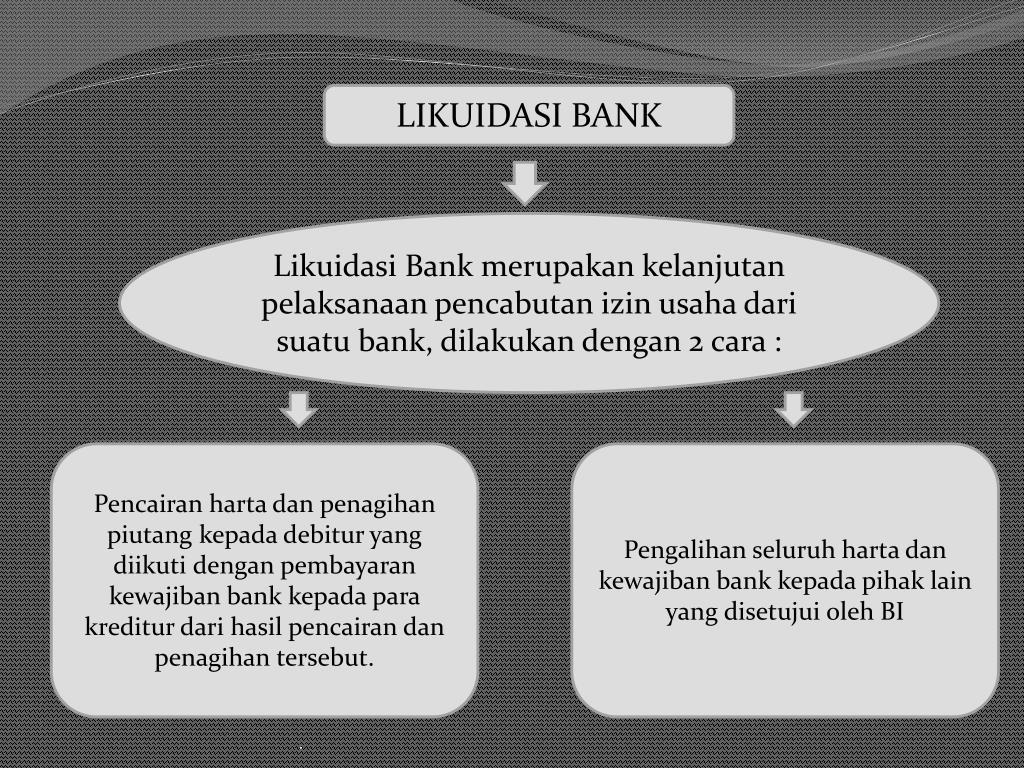 LIKUIDASI BANK Likuidasi Bank merupakankelanjutanpelaksanaanpencabutanizinusahadarisuatu bank, dilakukandengan 2 cara : Pencairanhartadanpenagihanpiutangkepadadebitur yang diikutidenganpembayarankewajiban bank kepadaparakrediturdarihasilpencairandanpenagihantersebut. Pengalihanseluruhhartadankewajiban bank kepadapihak lain yang disetujuioleh BI .