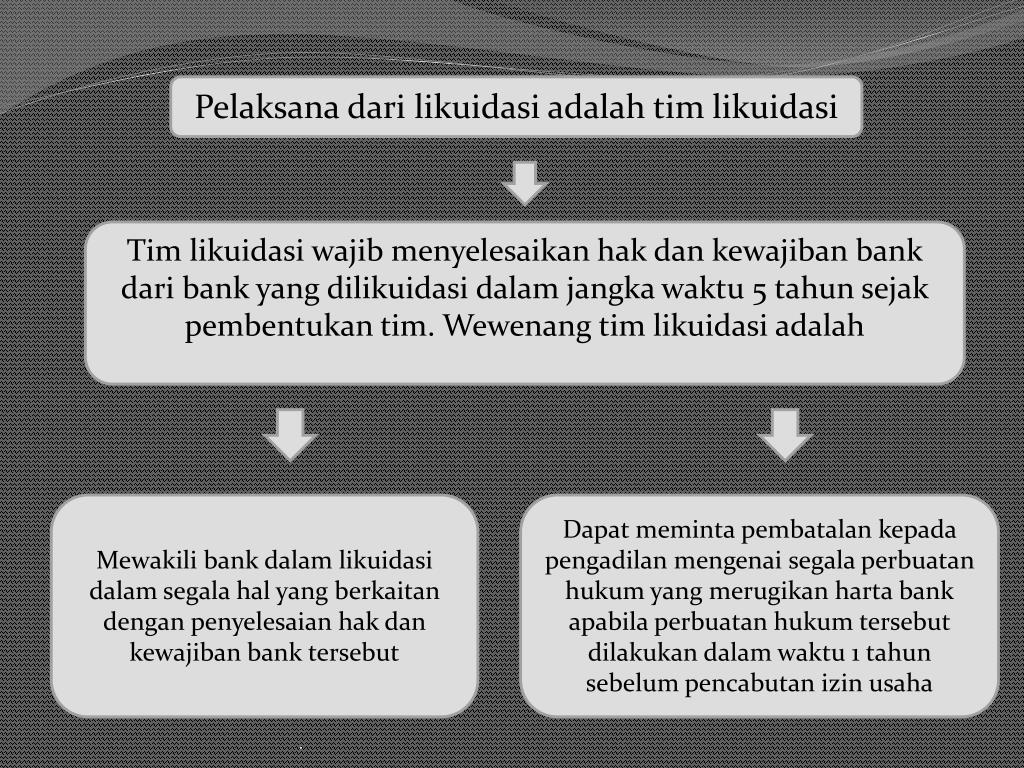 Pelaksanadarilikuidasiadalahtimlikuidasi Tim likuidasiwajibmenyelesaikanhakdankewajiban bank dari bank yang dilikuidasidalamjangkawaktu 5 tahunsejakpembentukantim. Wewenangtimlikuidasiadalah Mewakili bank dalamlikuidasidalamsegalahal yang berkaitandenganpenyelesaianhakdankewajiban bank tersebut Dapatmemintapembatalankepadapengadilanmengenaisegalaperbuatanhukum yang merugikanharta bank apabilaperbuatanhukumtersebutdilakukandalamwaktu 1 tahunsebelumpencabutanizinusaha .