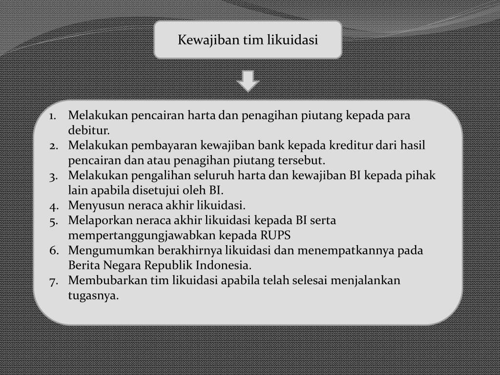 Kewajibantimlikuidasi Melakukanpencairanhartadanpenagihanpiutangkepadaparadebitur. Melakukanpembayarankewajiban bank kepadakrediturdarihasilpencairandanataupenagihanpiutangtersebut. Melakukanpengalihanseluruhhartadankewajiban BI kepadapihak lain apabiladisetujuioleh BI. Menyusunneracaakhirlikuidasi. Melaporkanneracaakhirlikuidasikepada BI sertamempertanggungjawabkankepada RUPS MengumumkanberakhirnyalikuidasidanmenempatkannyapadaBerita Negara Republik Indonesia. Membubarkantimlikuidasiapabilatelahselesaimenjalankantugasnya.
