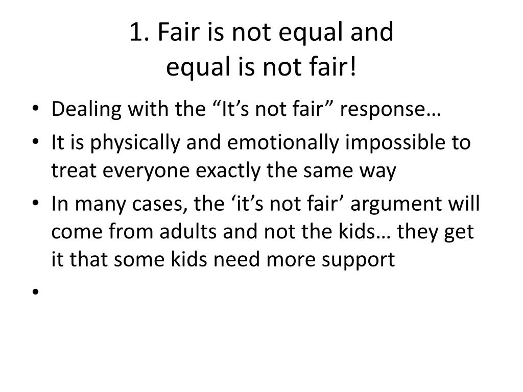 1. Fair is not equal and equal is not fair! • Dealing with the “It’s not fair” response… • It is physically and emotionally impossible to treat everyone exactly the same way • In many cases, the ‘it’s not fair’ argument will come from adults and not the kids… they get it that some kids need more support