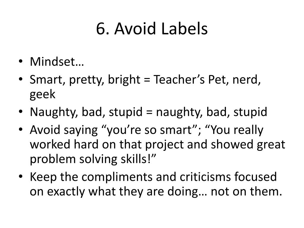 6. Avoid Labels • Mindset… • Smart, pretty, bright = Teacher’s Pet, nerd, geek • Naughty, bad, stupid = naughty, bad, stupid • Avoid saying “you’re so smart”; “You really worked hard on that project and showed great problem solving skills!” • Keep the compliments and criticisms focused on exactly what they are doing… not on them.