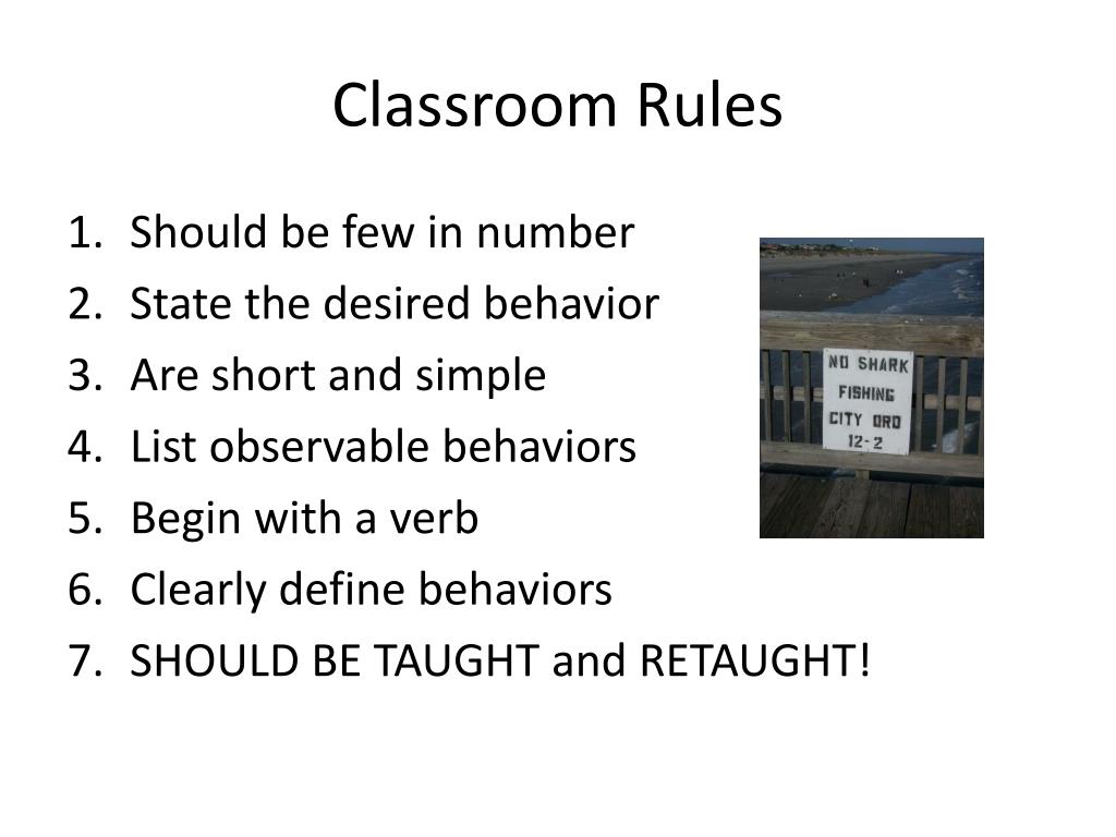 Classroom Rules • Should be few in number • State the desired behavior • Are short and simple • List observable behaviors • Begin with a verb • Clearly define behaviors • SHOULD BE TAUGHT and RETAUGHT!