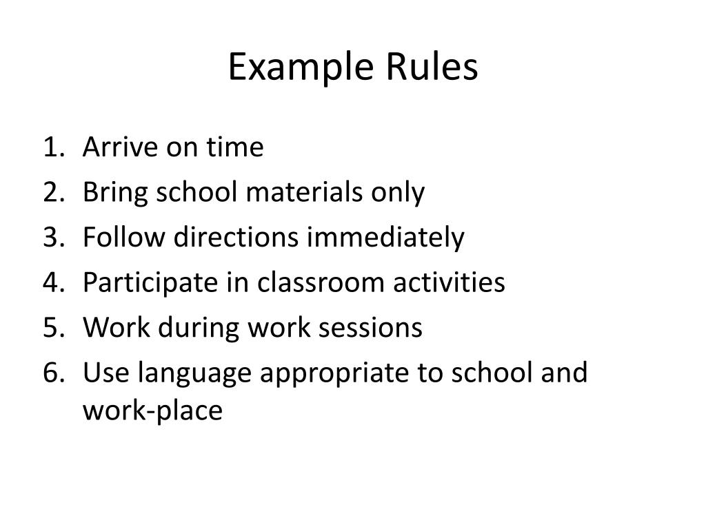 Example Rules • Arrive on time • Bring school materials only • Follow directions immediately • Participate in classroom activities • Work during work sessions • Use language appropriate to school and work-place