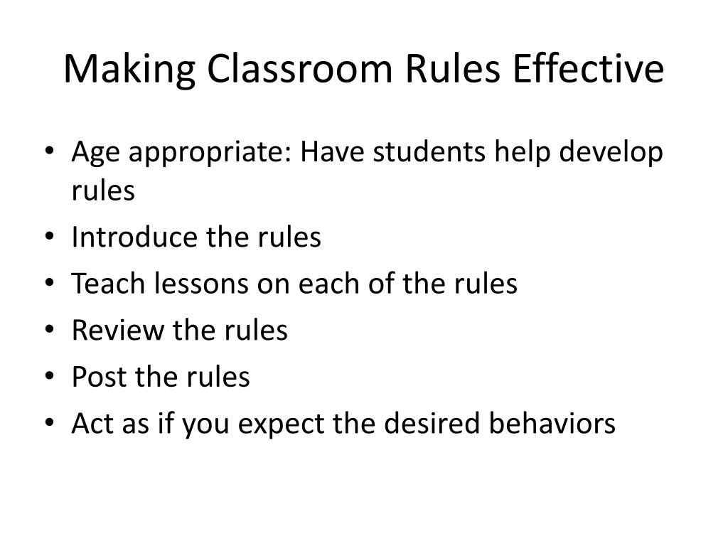 Making Classroom Rules Effective • Age appropriate: Have students help develop rules • Introduce the rules • Teach lessons on each of the rules • Review the rules • Post the rules • Act as if you expect the desired behaviors