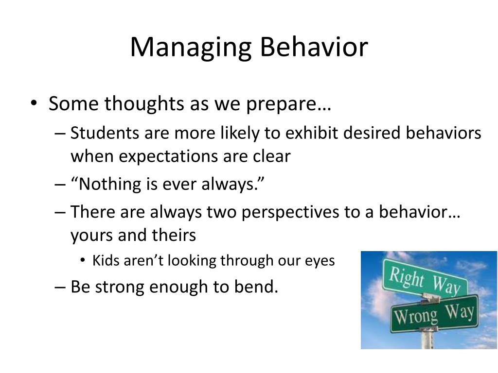 Managing Behavior • Some thoughts as we prepare… • Students are more likely to exhibit desired behaviors when expectations are clear • “Nothing is ever always.” • There are always two perspectives to a behavior… yours and theirs • Kids aren’t looking through our eyes • Be strong enough to bend.