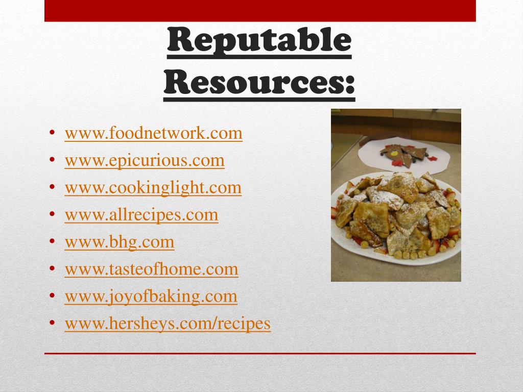 www.foodnetwork.com • www.epicurious.com • www.cookinglight.com • www.allrecipes.com • www.bhg.com • www.tasteofhome.com • www.joyofbaking.com • www.hersheys.com/recipes Reputable Resources: