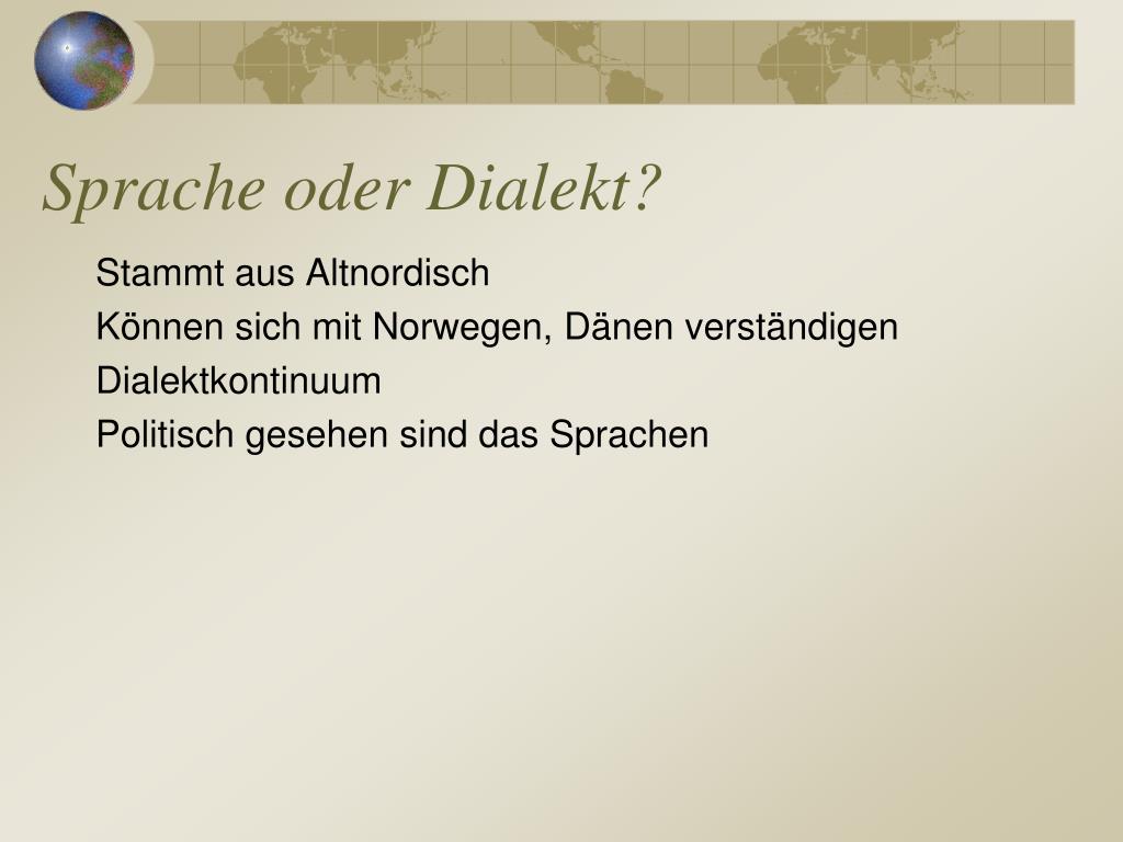Sprache oder Dialekt? Stammt aus Altnordisch Können sich mit Norwegen, Dänen verständigen Dialektkontinuum Politisch gesehen sind das Sprachen