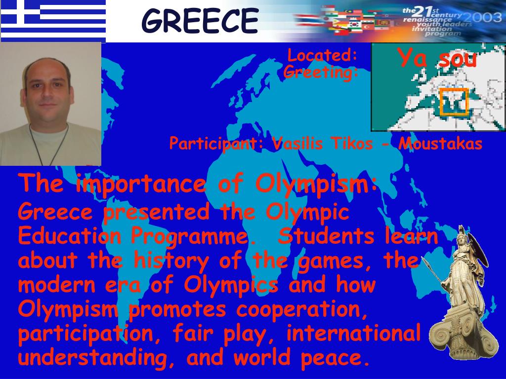GREECE Ya sou Located: Greeting: Greece presented the Olympic Education Programme. Students learn about the history of the games, the modern era of Olympics and how Olympism promotes cooperation, participation, fair play, international understanding, and world peace. Participant: Vasilis Tikos - Moustakas The importance of Olympism: