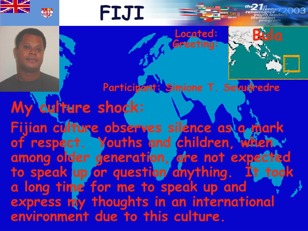FIJI Bula Located: Greeting: Fijian culture observes silence as a mark of respect. Youths and children, when among older generation, are not expected to speak up or question anything. It took a long time for me to speak up and express my thoughts in an international environment due to this culture. Participant: Simione T. Sevudredre My culture shock: