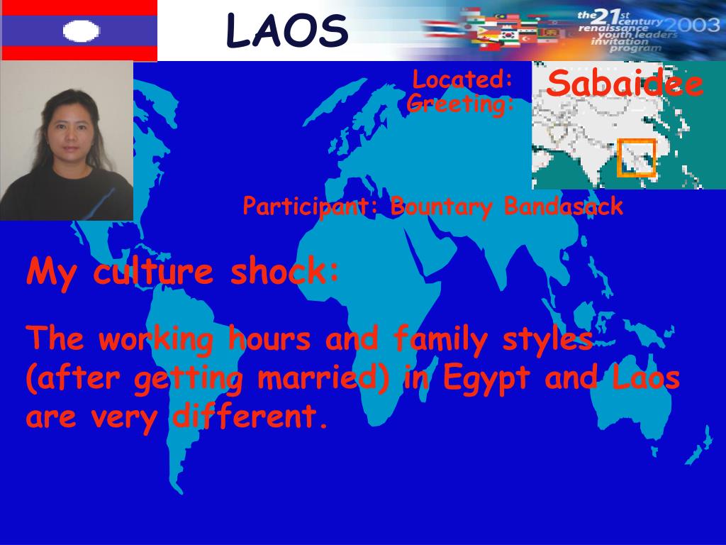 LAOS Sabaidee Located: Greeting: The working hours and family styles (after getting married) in Egypt and Laos are very different. Participant: Bountary Bandasack My culture shock: