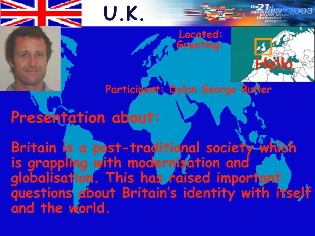U.K. Located: Greeting: Hello Britain is a post-traditional society which is grappling with modernisation and globalisation. This has raised important questions about Britain’s identity with itself and the world. Participant: Dylan George Butler Presentation about:
