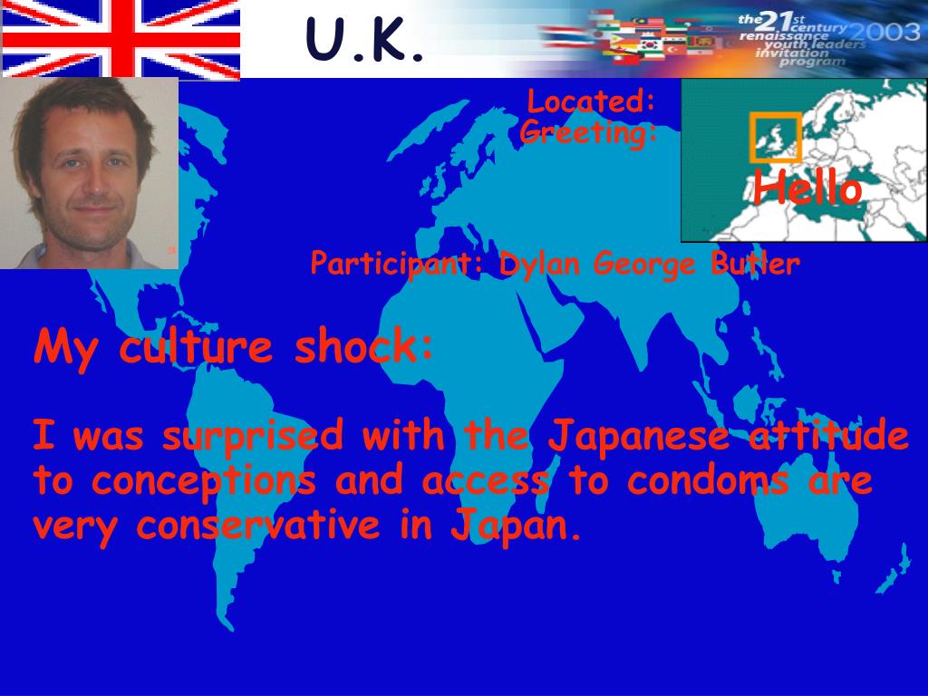 U.K. Located: Greeting: Hello I was surprised with the Japanese attitude to conceptions and access to condoms are very conservative in Japan. Participant: Dylan George Butler My culture shock: