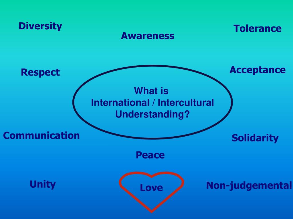 Diversity Tolerance Awareness Acceptance Respect What is International / Intercultural Understanding? Communication Solidarity Peace Unity Love Non-judgemental