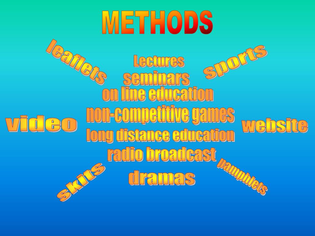 METHODS leaflets Lectures sports seminars on line education non-competitive games video website long distance education radio broadcast dramas pamphlets skits