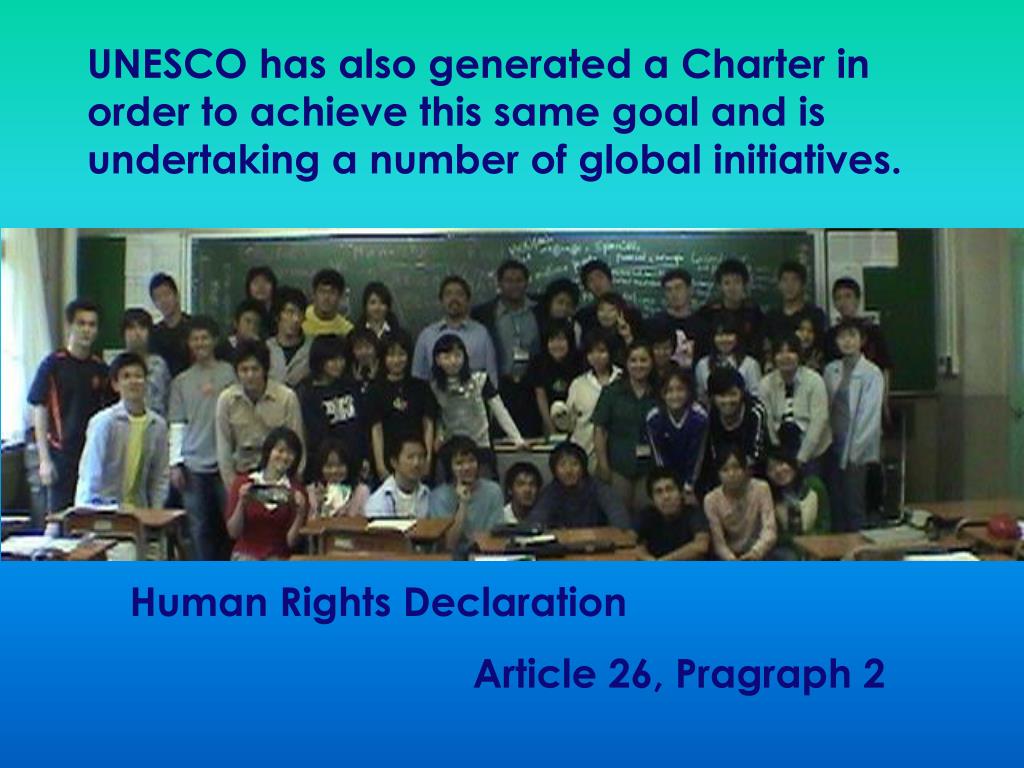 UNESCO has also generated a Charter in order to achieve this same goal and is undertaking a number of global initiatives. Human Rights Declaration Article 26, Pragraph 2