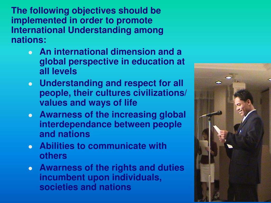 The following objectives should be implemented in order to promote International Understanding among nations: • An international dimension and a global perspective in education at all levels • Understanding and respect for all people, their cultures civilizations/ values and ways of life • Awarness of the increasing global interdependance between people and nations • Abilities to communicate with others • Awarness of the rights and duties incumbent upon individuals, societies and nations