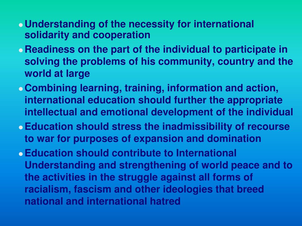 Understanding of the necessity for international solidarity and cooperation • Readiness on the part of the individual to participate in solving the problems of his community, country and the world at large • Combining learning, training, information and action, international education should further the appropriate intellectual and emotional development of the individual • Education should stress the inadmissibility of recourse to war for purposes of expansion and domination • Education should contribute to International Understanding and strengthening of world peace and to the activities in the struggle against all forms of racialism, fascism and other ideologies that breed national and international hatred
