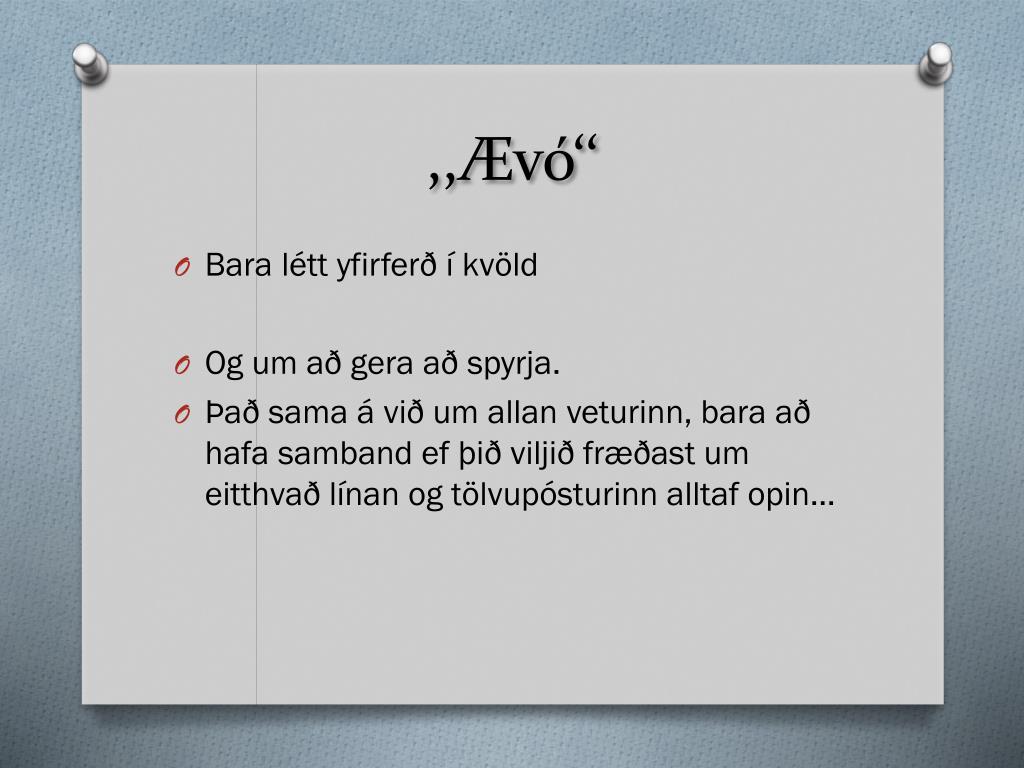 ,,Ævó‘‘ • Bara létt yfirferð í kvöld • Og um að gera að spyrja. • Það sama á við um allan veturinn, bara að hafa samband ef þið viljið fræðast um eitthvað línan og tölvupósturinn alltaf opin…