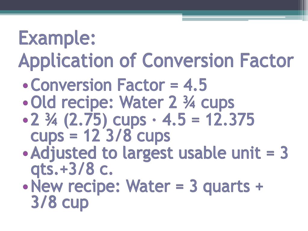 Example: Application of Conversion Factor • Conversion Factor = 4.5 • Old recipe: Water 2 ¾ cups • 2 ¾ (2.75) cups ∙ 4.5 = 12.375 cups = 12 3/8 cups • Adjusted to largest usable unit = 3 qts.+3/8 c. • New recipe: Water= 3 quarts + 3/8 cup