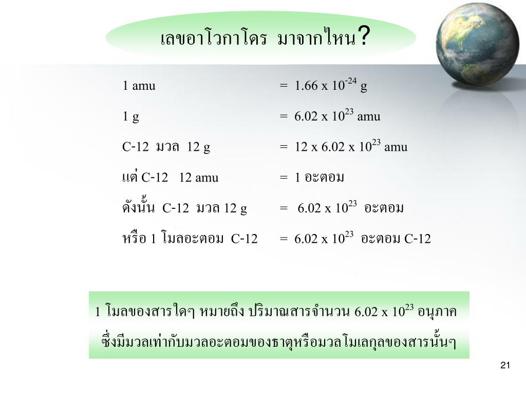 เลขอาโวกาโดร มาจากไหน? 1 amu = 1.66 x 10-24 g 1 g = 6.02 x 1023 amu C-12 มวล 12 g = 12 x 6.02 x 1023 amu แต่ C-12 12 amu = 1 อะตอม ดังนั้น C-12 มวล 12 g = 6.02 x 1023อะตอม หรือ 1 โมลอะตอม C-12 = 6.02 x 1023อะตอม C-12 1 โมลของสารใดๆ หมายถึง ปริมาณสารจำนวน 6.02 x 1023อนุภาค ซึ่งมีมวลเท่ากับมวลอะตอมของธาตุหรือมวลโมเลกุลของสารนั้นๆ