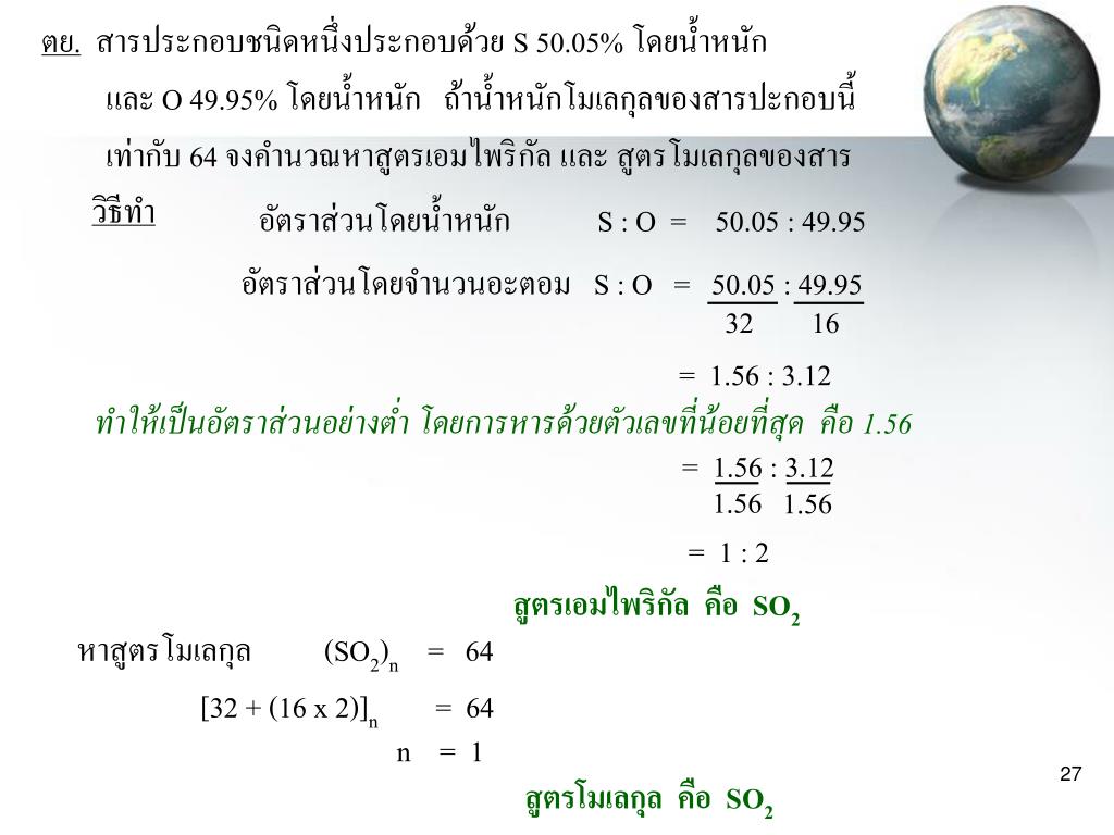 วิธีทำ อัตราส่วนโดยน้ำหนัก S : O = 50.05 : 49.95 อัตราส่วนโดยจำนวนอะตอม S : O = 50.05 : 49.95 32 16 = 1.56 : 3.12 = 1.56 : 3.12 1.56 1.56 = 1 : 2 หาสูตรโมเลกุล (SO2)n = 64 [32 + (16 x 2)]n = 64 n = 1 ตย. สารประกอบชนิดหนึ่งประกอบด้วย S 50.05% โดยน้ำหนัก และ O 49.95% โดยน้ำหนัก ถ้าน้ำหนักโมเลกุลของสารปะกอบนี้ เท่ากับ 64 จงคำนวณหาสูตรเอมไพริกัล และ สูตรโมเลกุลของสาร ทำให้เป็นอัตราส่วนอย่างต่ำ โดยการหารด้วยตัวเลขที่น้อยที่สุด คือ 1.56 สูตรเอมไพริกัล คือ SO2 สูตรโมเลกุล คือ SO2