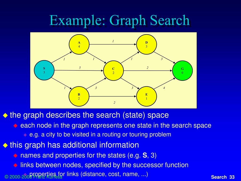 A 4 D 3 1 1 1 3 1 S 3 C 2 G 0 5 2 1 3 3 4 B 2 E 1 2 Example: Graph Search • the graph describes the search (state) space • each node in the graph represents one state in the search space • e.g. a city to be visited in a routing or touring problem • this graph has additional information • names and properties for the states (e.g. S, 3) • links between nodes, specified by the successor function • properties for links (distance, cost, name, ...)