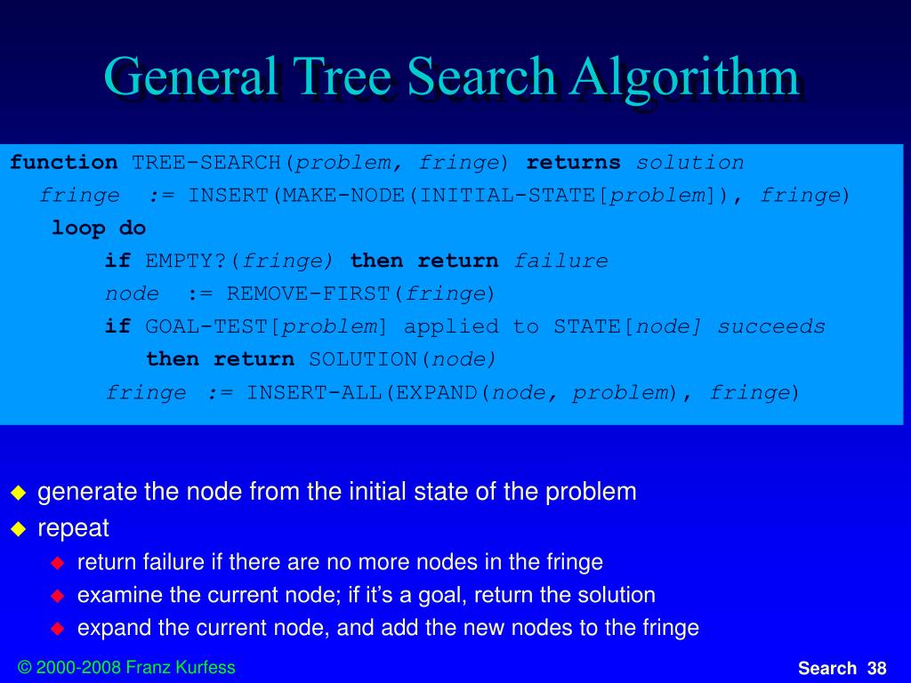 function TREE-SEARCH(problem, fringe) returnssolution fringe := INSERT(MAKE-NODE(INITIAL-STATE[problem]), fringe) loop do if EMPTY?(fringe) then return failure node := REMOVE-FIRST(fringe) if GOAL-TEST[problem] applied to STATE[node] succeeds then return SOLUTION(node) fringe := INSERT-ALL(EXPAND(node, problem), fringe) General Tree Search Algorithm • generate the node from the initial state of the problem • repeat • return failure if there are no more nodes in the fringe • examine the current node; if it’s a goal, return the solution • expand the current node, and add the new nodes to the fringe