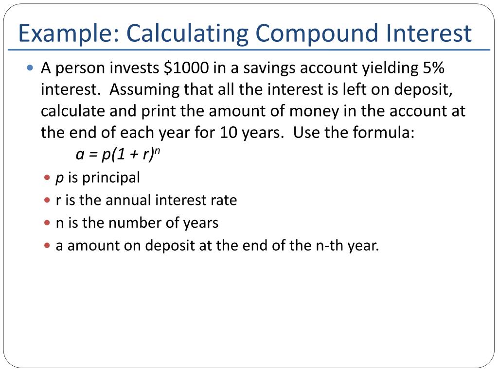 Example: Calculating Compound Interest • A person invests $1000 in a savings account yielding 5% interest. Assuming that all the interest is left on deposit, calculate and print the amount of money in the account at the end of each year for 10 years. Use the formula:a = p(1 + r)n • p is principal • r is the annual interest rate • n is the number of years • a amount on deposit at the end of the n-th year.