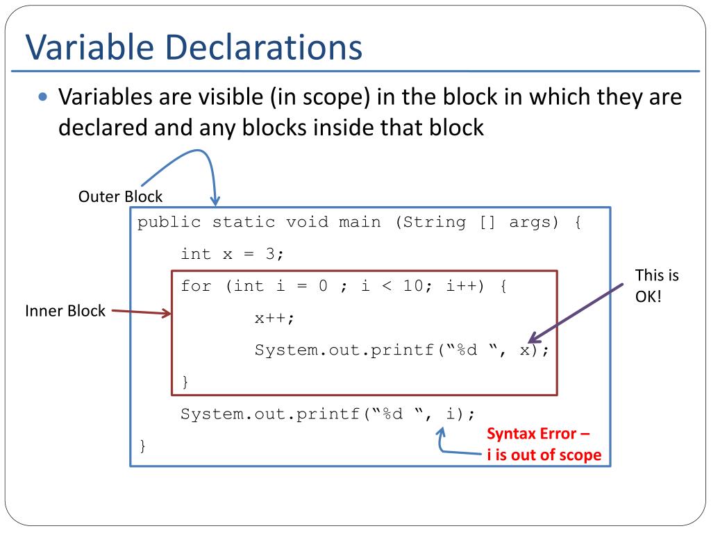 Variable Declarations Outer Block public static void main (String [] args) { int x = 3; for (inti = 0 ; i < 10; i++) { x++; System.out.printf(“%d “, x); } System.out.printf(“%d “, i); } This is OK! Inner Block Syntax Error – i is out of scope Variables are visible (in scope) in the block in which they are declared and any blocks inside that block