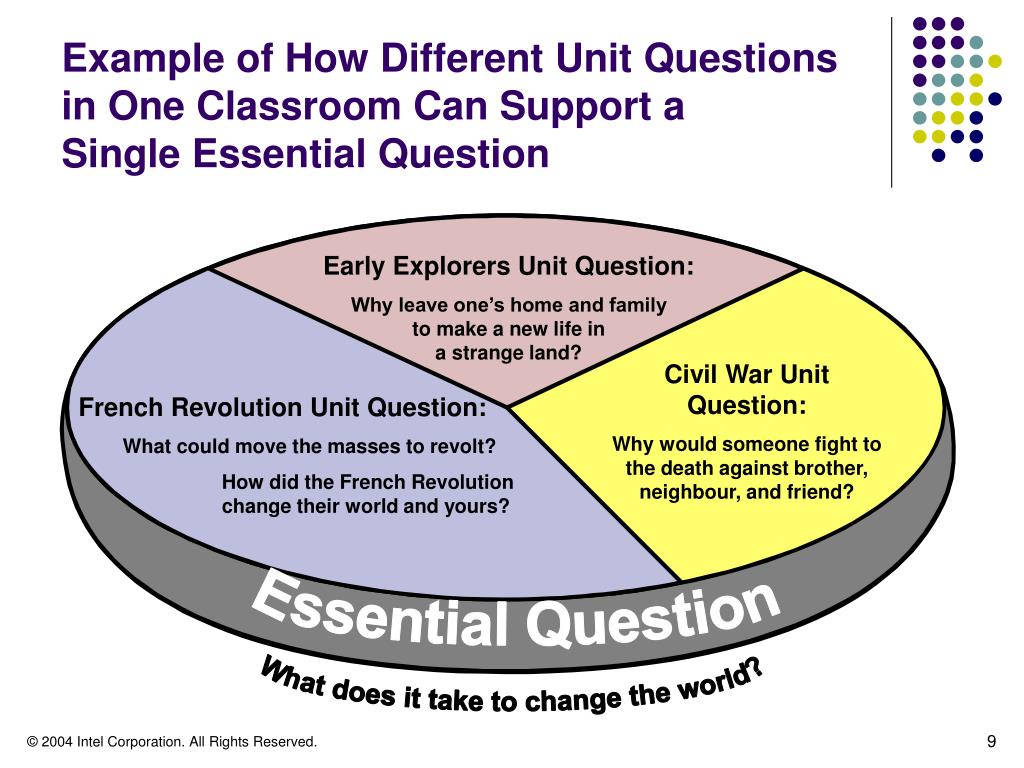 Example of How Different Unit Questions in One Classroom Can Support a Single Essential Question Early Explorers Unit Question: Why leave one’s home and family to make a new life in a strange land? Civil War Unit Question: Why would someone fight to the death against brother, neighbour, and friend? French Revolution Unit Question: What could move the masses to revolt? How did the French Revolution change their world and yours? Essential Question What does it take to change the world?