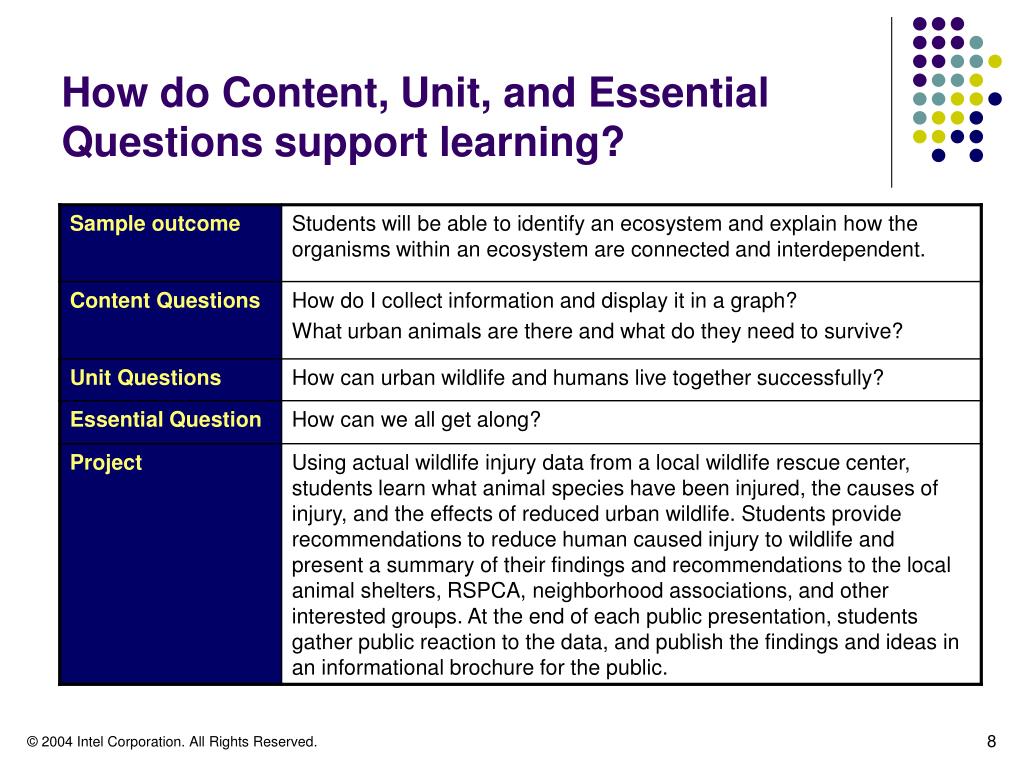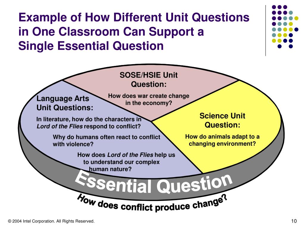 Example of How Different Unit Questions in One Classroom Can Support a Single Essential Question SOSE/HSIE Unit Question: How does war create change in the economy? Language Arts Unit Questions: In literature, how do the characters in Lord of the Flies respond to conflict? Why do humans often react to conflict with violence? How does Lord of the Flies help us to understand our complex human nature? Science Unit Question: How do animals adapt to a changing environment? Essential Question How does conflict produce change?