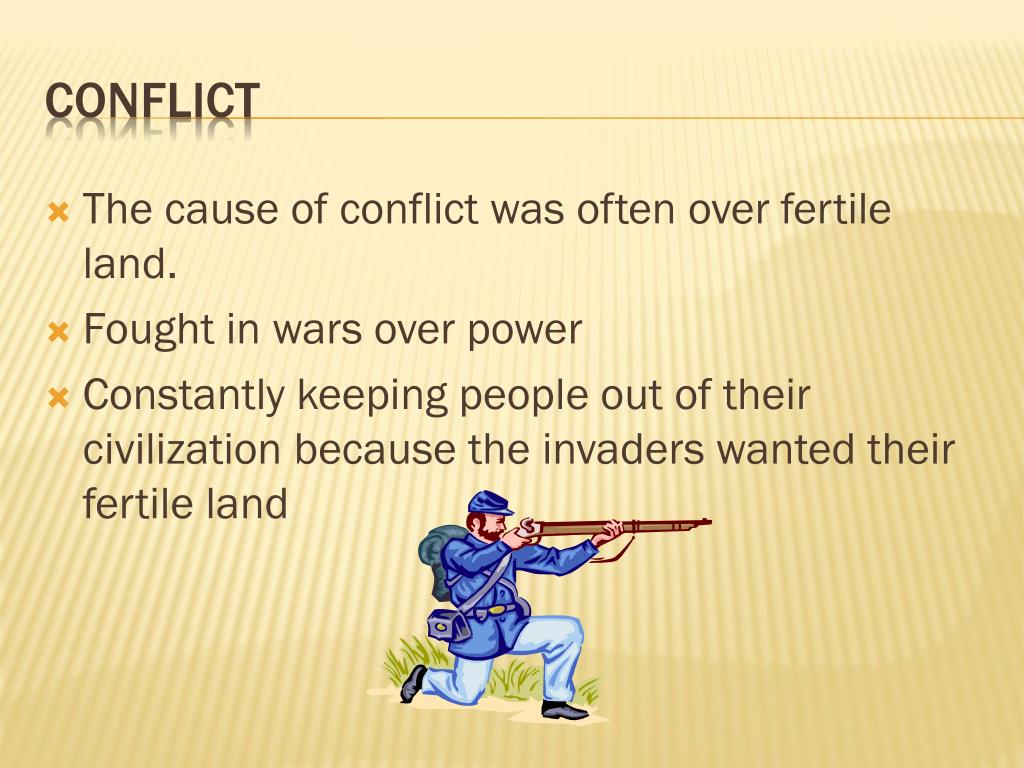 The cause of conflict was often over fertile land. Fought in wars over power Constantly keeping people out of their civilization because the invaders wanted their fertile land conflict