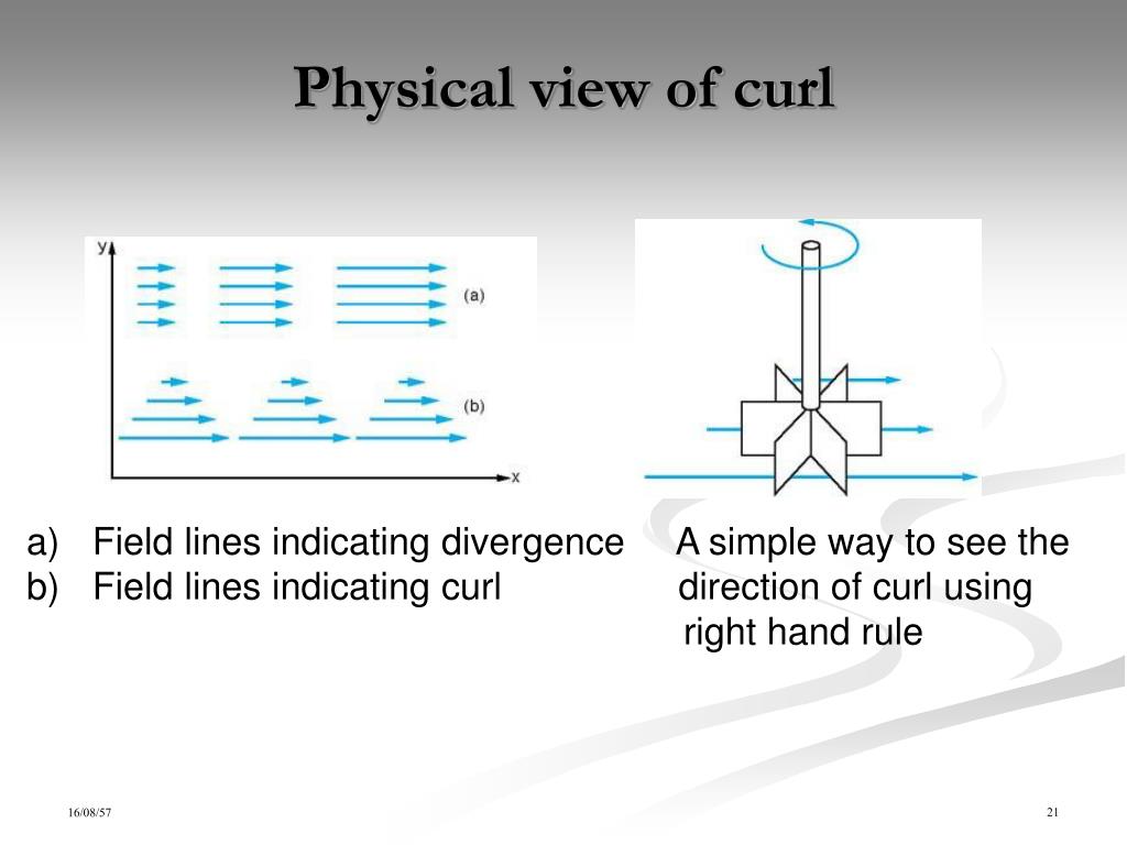 Physical view of curl • Field lines indicating divergence A simple way to see the • Field lines indicating curl direction of curl using • right hand rule