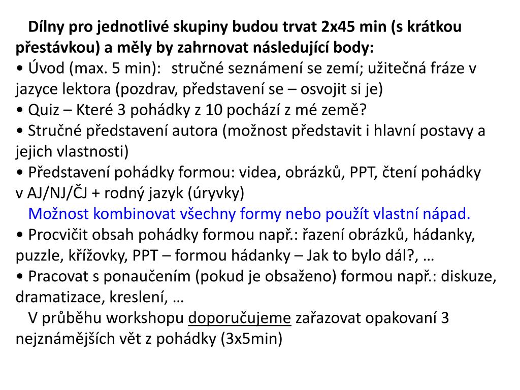 Dílny pro jednotlivé skupiny budou trvat 2x45 min (s krátkou přestávkou) a měly by zahrnovat následující body: • Úvod (max. 5 min): stručné seznámení se zemí; užitečná fráze v jazyce lektora (pozdrav, představení se – osvojit si je) • Quiz – Které 3 pohádky z 10 pochází z mé země? • Stručné představení autora (možnost představit i hlavní postavy a jejich vlastnosti) • Představení pohádky formou: videa, obrázků, PPT, čtení pohádky v AJ/NJ/ČJ + rodný jazyk (úryvky) Možnost kombinovat všechny formy nebo použít vlastní nápad. • Procvičit obsah pohádky formou např.: řazení obrázků, hádanky, puzzle, křížovky, PPT – formou hádanky – Jak to bylo dál?, … • Pracovat s ponaučením (pokud je obsaženo) formou např.: diskuze, dramatizace, kreslení, … V průběhu workshopu doporučujeme zařazovat opakovaní 3 nejznámějších vět z pohádky (3x5min)