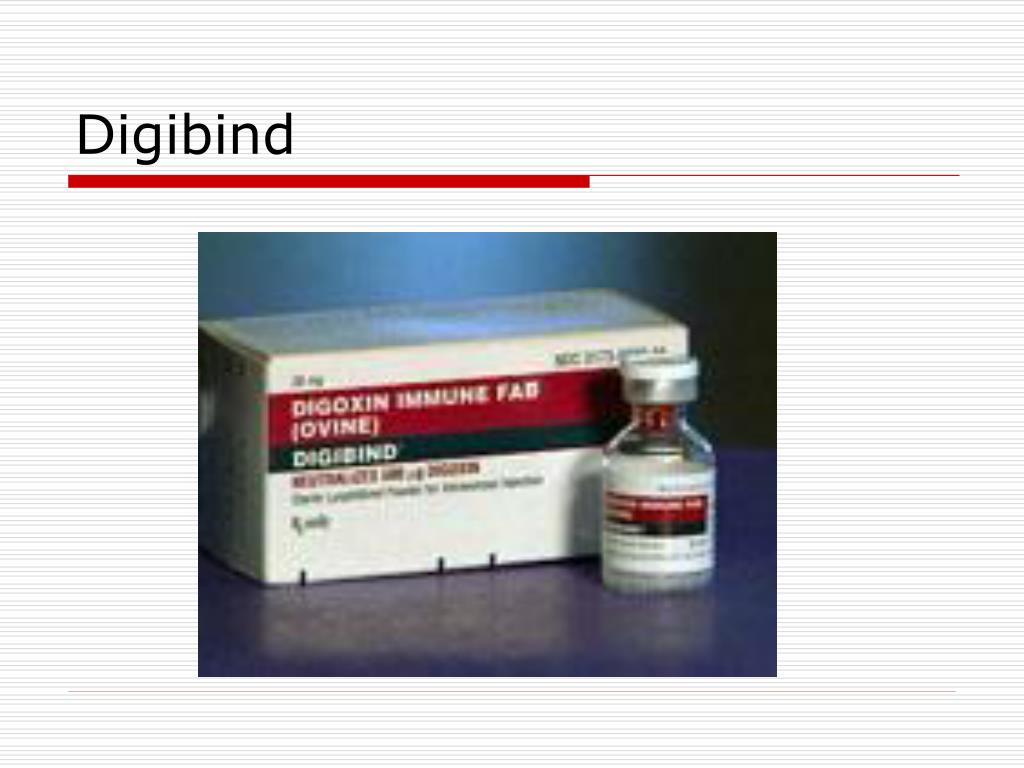 Postępowanie w zatruciu: • Arytmia – fenytoina, lidokaina, -adrenolityki • Bradykardia i bloki I i II st. – adrenalina • UWAGA na kardiowersję! – z Digoxyną może dać migotanie komór. • Ciężkie zatrucie – antidotum: Digibind Digitalis-Antidot BM