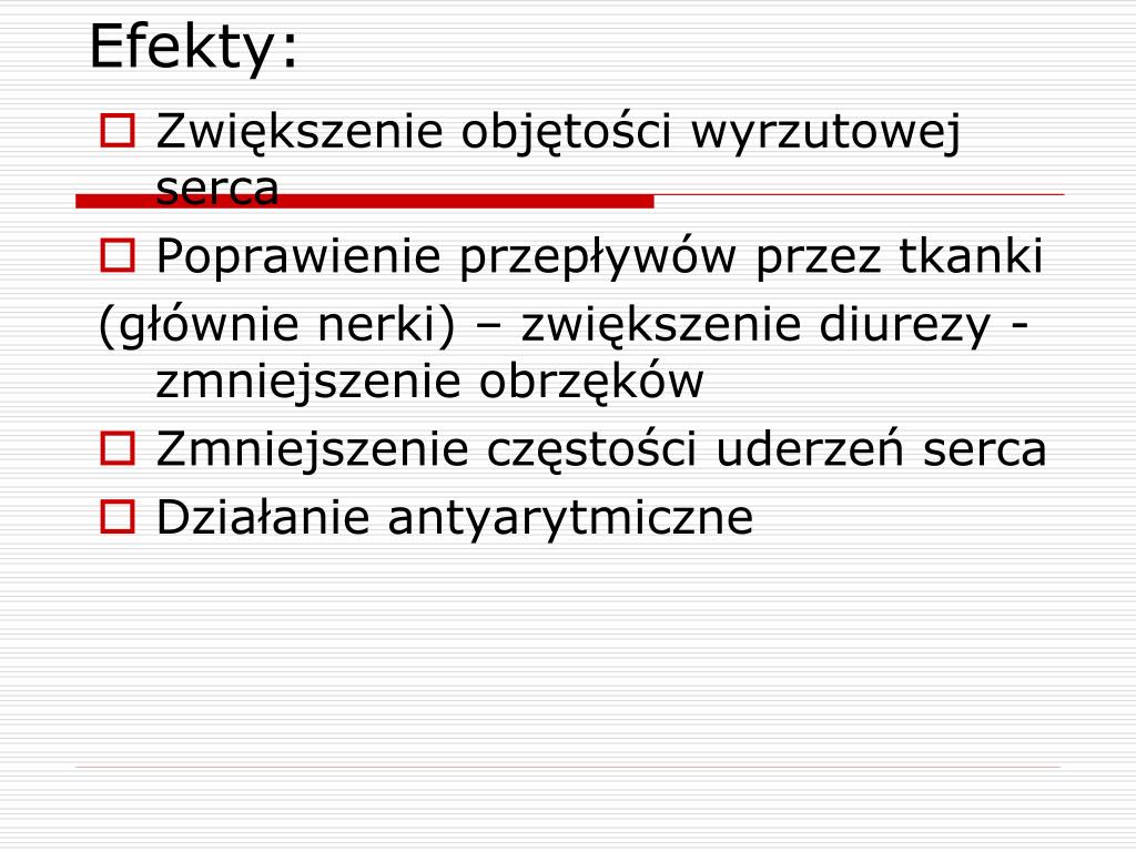 Efekty: • Zwiększenie objętości wyrzutowej serca • Poprawienie przepływów przez tkanki (głównie nerki) – zwiększenie diurezy - zmniejszenie obrzęków • Zmniejszenie częstości uderzeń serca • Działanie antyarytmiczne
