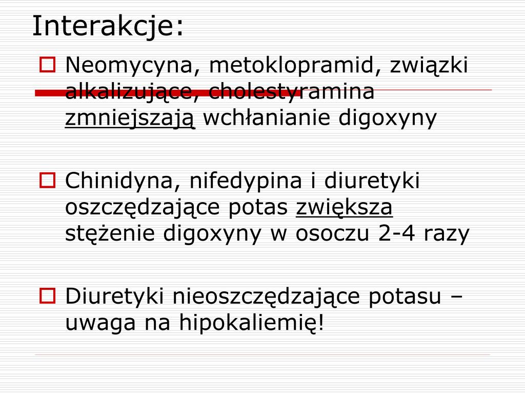 Interakcje: • Neomycyna, metoklopramid, związki alkalizujące, cholestyramina zmniejszają wchłanianie digoxyny • Chinidyna, nifedypina i diuretyki oszczędzające potas zwiększa stężenie digoxyny w osoczu 2-4 razy • Diuretyki nieoszczędzające potasu – uwaga na hipokaliemię!