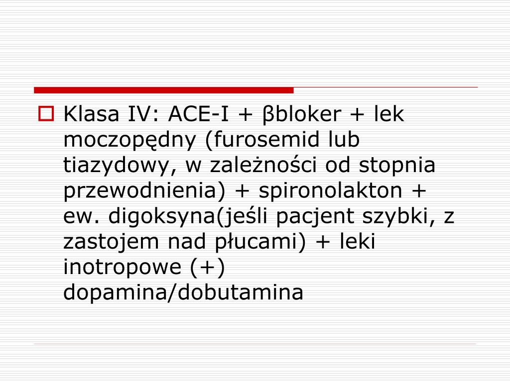 Klasa IV: ACE-I + βbloker + lek moczopędny (furosemid lub tiazydowy, w zależności od stopnia przewodnienia) + spironolakton + ew. digoksyna(jeśli pacjent szybki, z zastojem nad płucami) + leki inotropowe (+) dopamina/dobutamina
