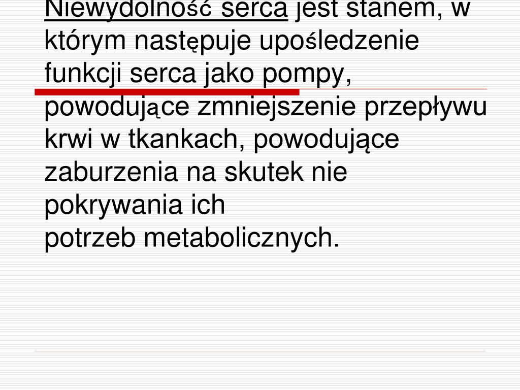 Niewydolność serca jest stanem, w którym następuje upośledzenie funkcji serca jako pompy, powodujące zmniejszenie przepływu krwi w tkankach, powodujące zaburzenia na skutek nie pokrywania ichpotrzeb metabolicznych.